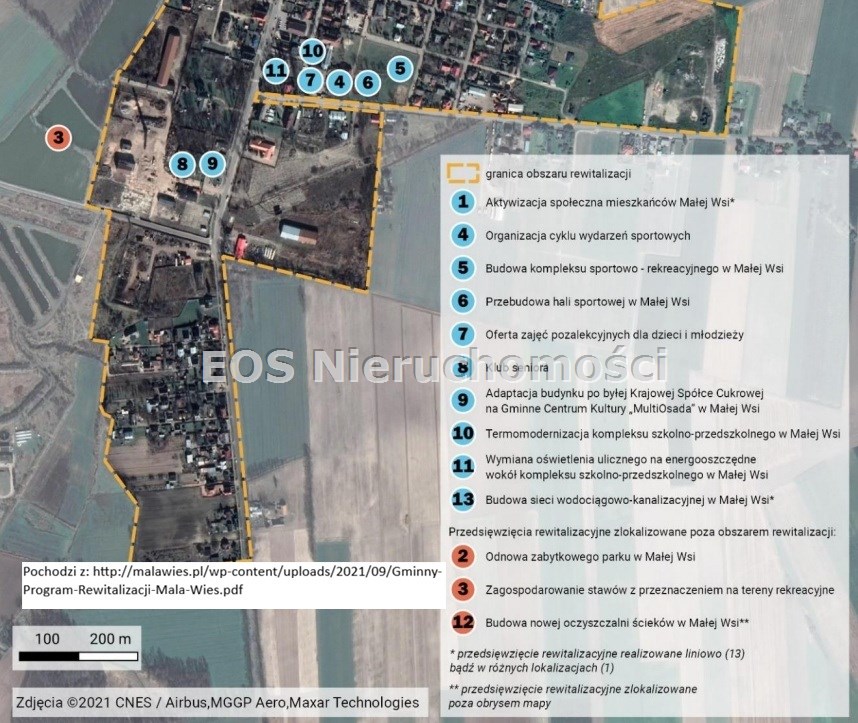 Dużym atutem działki jest położenie bezpośrednio przy stawach, które w Gminnym Programie Rewitalizacji Gminy Mała Wieś na lata 2021–2030 zostały przewidziane do zagospodarowania na cele rekreacyjne. To interesująca propozycja zarówno dla inwestorów, jak i osób szukających gruntu z potencjałem rozwoju.